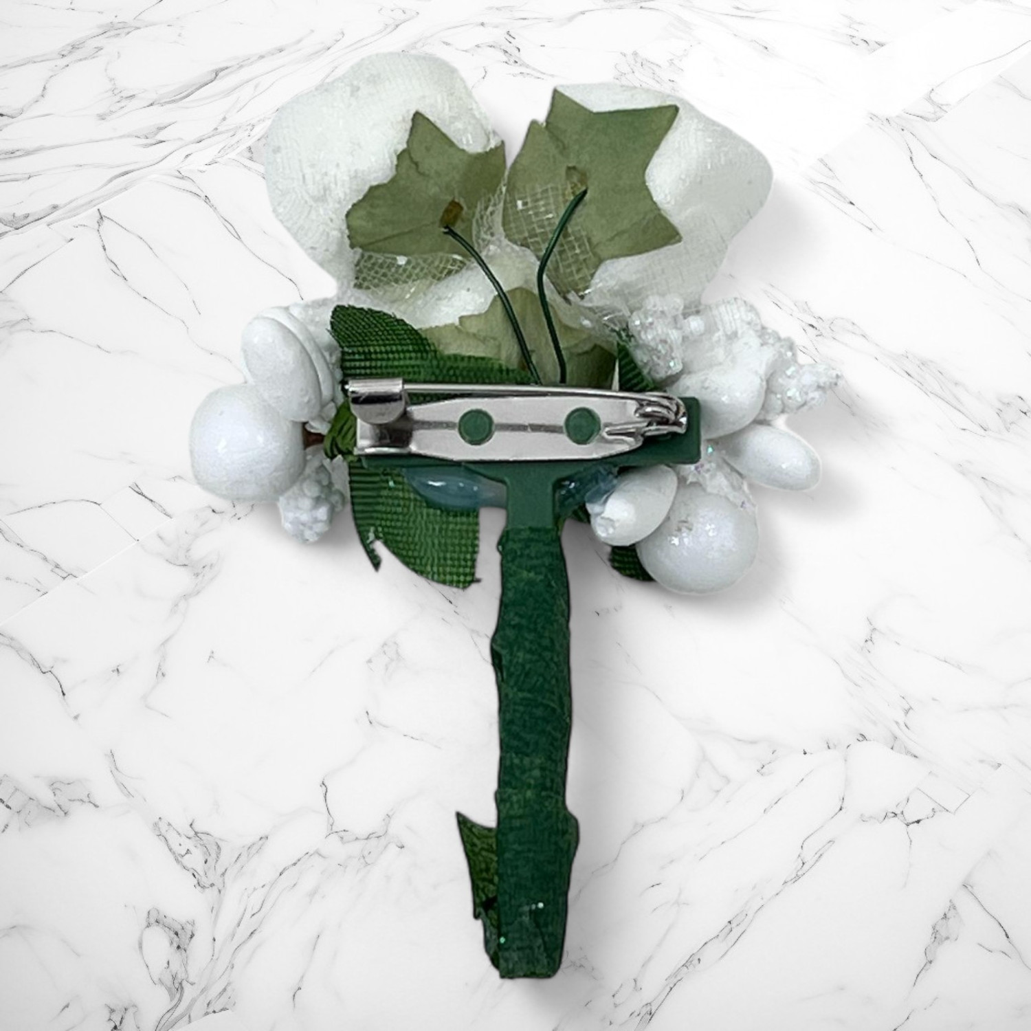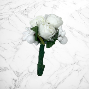 Cocarda este realizata din trandafiri artificiali de culoare ivory, accesorizati cu ghiocei.