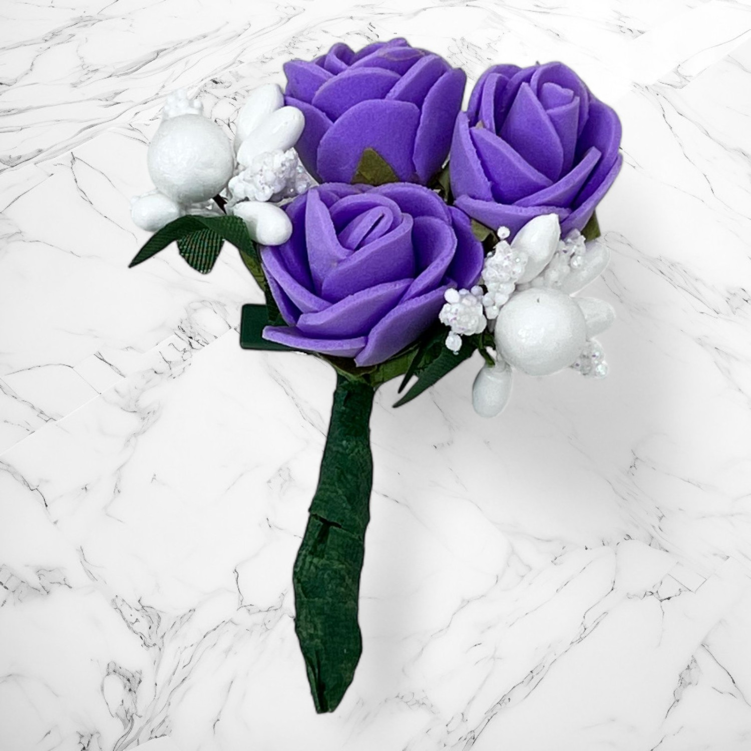 Cocarda este realizata din trandafiri artificiali de culoare lila, accesorizati cu ghiocei.