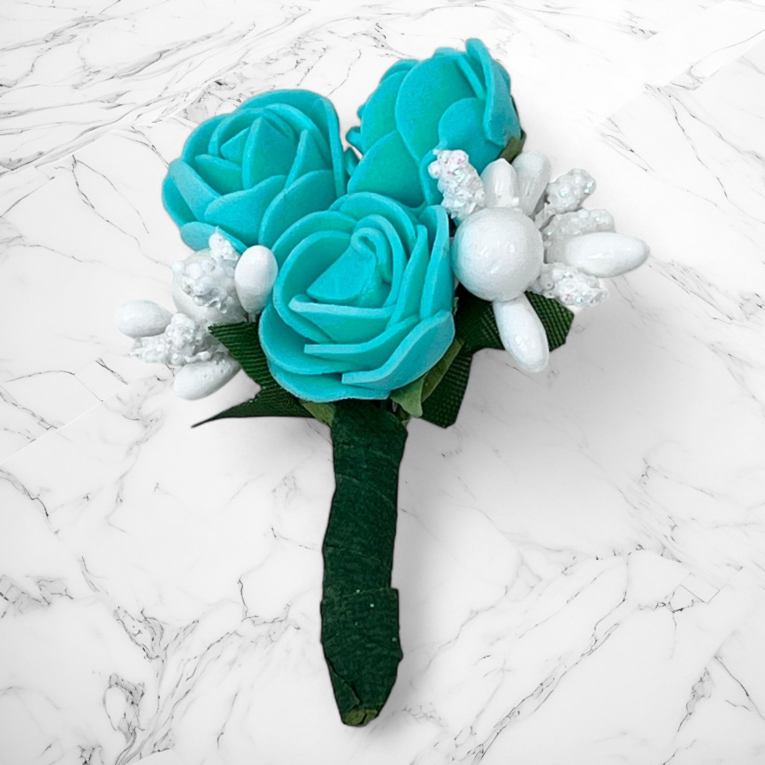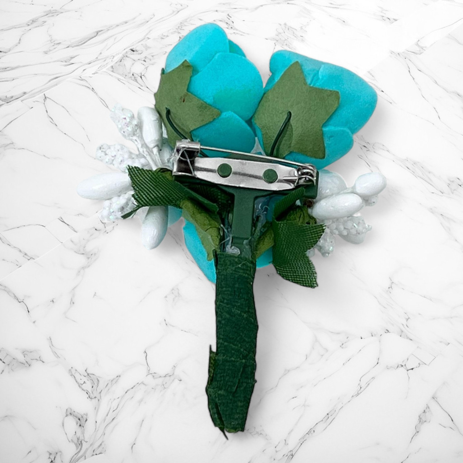 Cocarda este realizata din trandafiri artificiali de culoare verde menta, accesorizati cu ghiocei.
