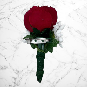 Aceste cocarde realizate din flori artificiale de bujori rosii sunt accesorizate cu ghiocei.
