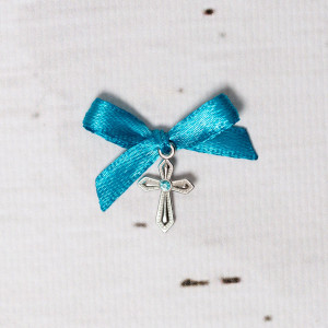 Cruciulitele cu pietricica bleu si fundita turcoaz sunt o alegere inspirata pentru botezul unui baietel.