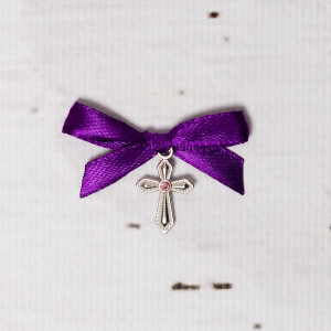 Una dintre cele mai in voga culori ale anului este mov, iar pentru botezul finutei tale, poti alege negresit cruciulite botez cu pietricica roz si fundita mov.