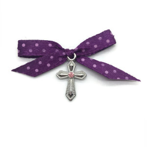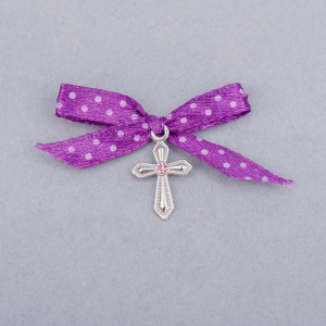 Niste accesorii de botez indispensabile in biserica la slujba de crestinare a bebelusului sunt cruciulitele botez cu pietricica si fundita mov cu buline.