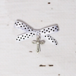Comanda acum produsul "Cruciulite botez cu pietricica transparenta si fundita alba cu buline negre".