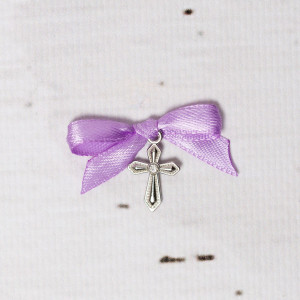 Aceste cruciulite simple cu fundita lila pot fi in ton cu alte produse cu decor lila. Cruciulitele metalice au o pietricica discreta la mijloc. Dupa botez, oaspetii vor pastra micile cadouri religioase ca amintire.