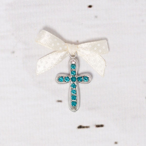 Printre articolele necesare la biserica in timpul slujbei de botez se numara si cruciulitele. In calitate de nasa a unui baietel poti alege cruciulite botez cu strassuri si fundita ivory cu buline. Cruciulitele se ofera invitatilor si se prind cu ace, care pot fi comandate separat.