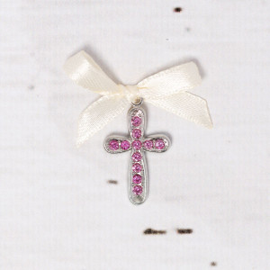 Cruciulitele cu strassuri roz si fundita ivory sunt acele cadouri religioase care se ofera cu ocazia botezului unei fetite. Cea care le cumpara si le daruieste invitatilor prezenti la slujba este chiar nasa de botez a copilasului.