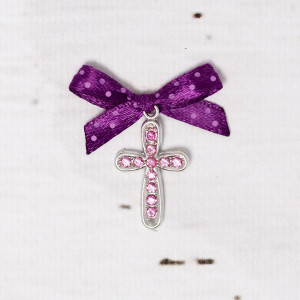 Cruciulitele de botez cu strassuri roz si fundita mov cu buline reprezinta o optiune de cadou din partea nasilor pentru cei care asista la ceremonia religioasa a finei lor.