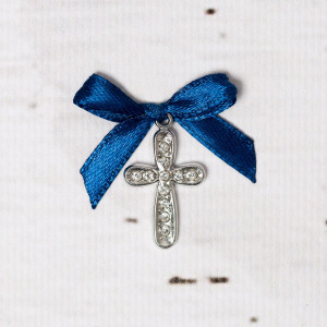 Daca esti nasa de botez a unui baietel si vrei ca ceremonia de botez sa fie perfecta, nu uita de micile detalii si cumpara cruciulite botez cu strassuri transparente si fundita bleumarin, cum este modelul din imagine.