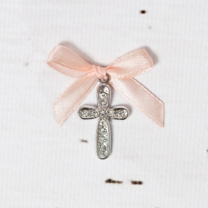 Pentru o fetita dragalasa care urmeaza sa primeasca taina botezului in curand, nasii acesteia pot alege cruciulite botez cu strassuri transparente si fundita somon.