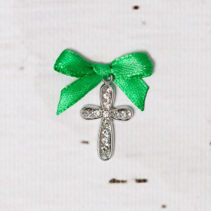 Pentru botezul unui baietel, nasa acestuia poate alege niste simboluri religioase sub forma de cruciulite botez cu strassuri transparente si fundita verde, mai ales daca piesele din trusou, respectiv lumanarea au decor verde.