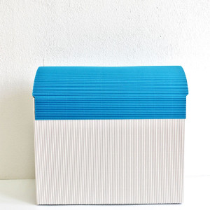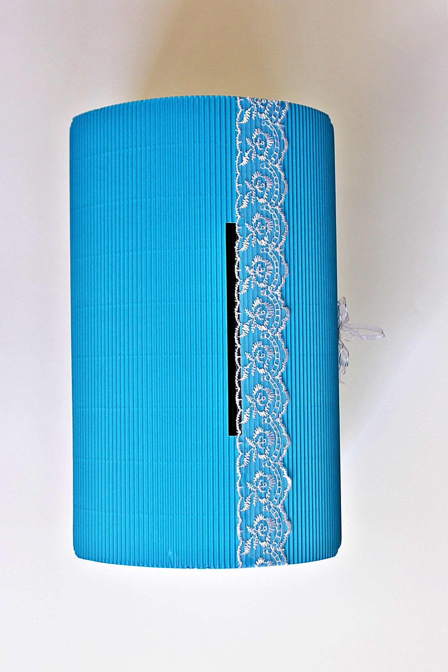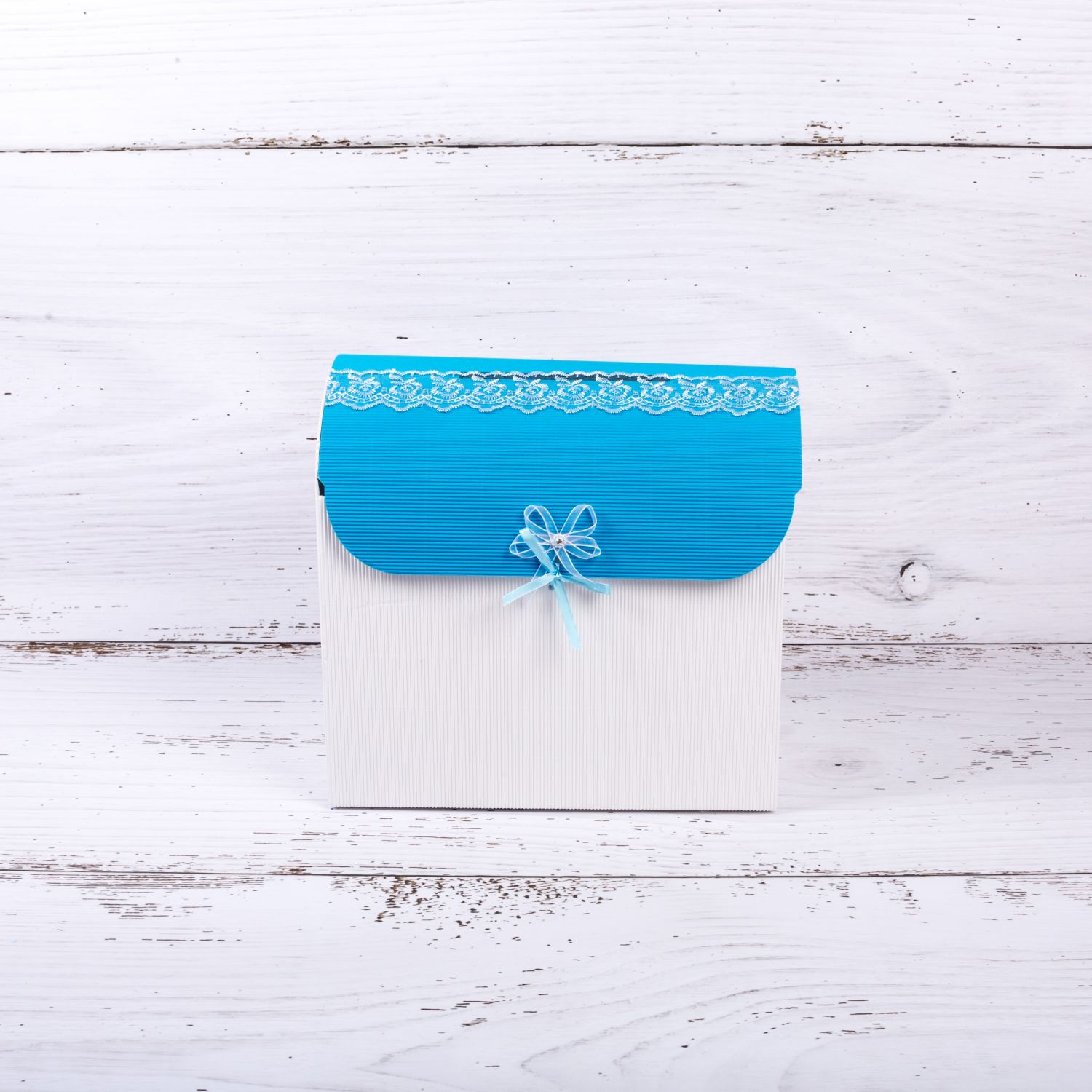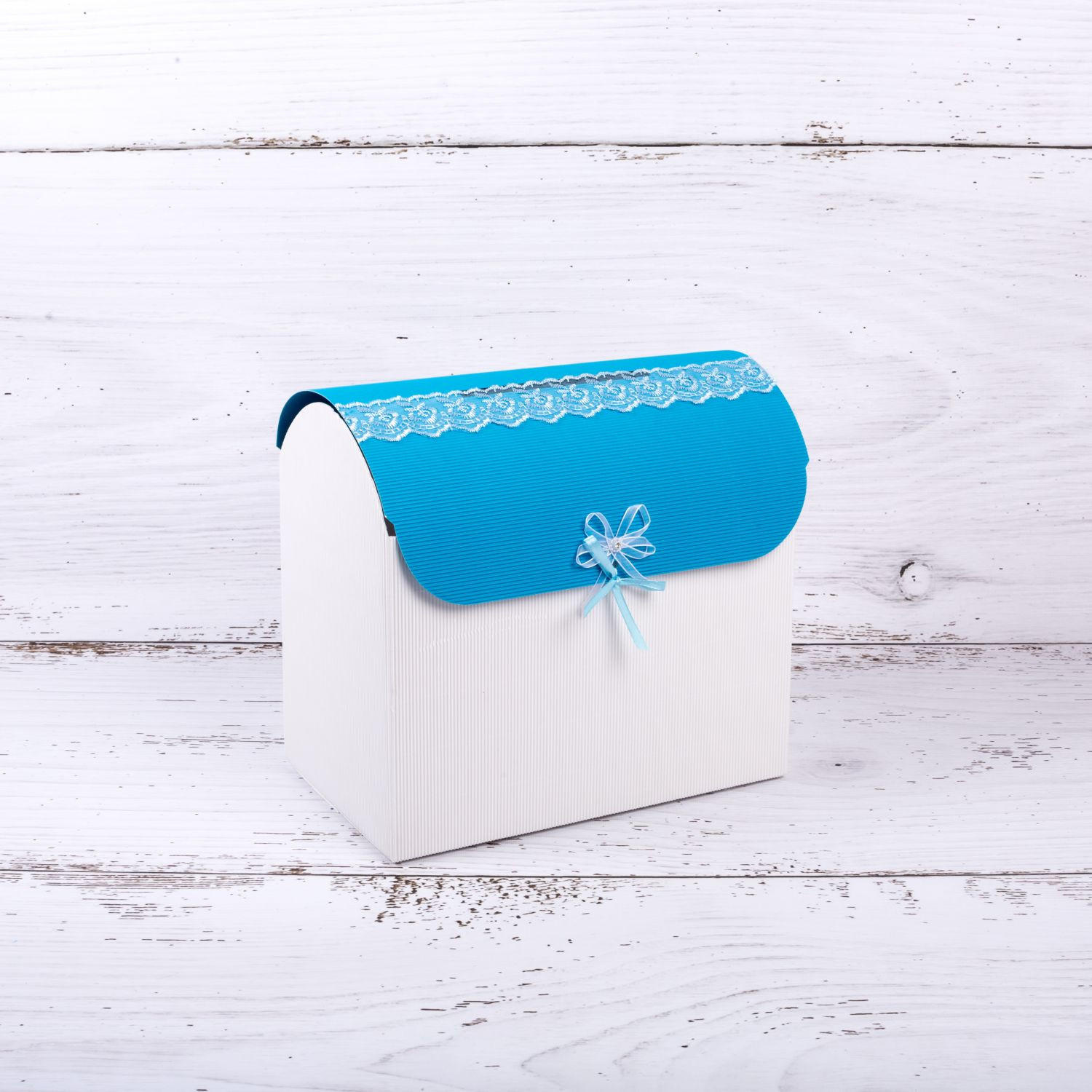 Cutia de dar in forma de cufar, realizata din carton ondulat alb este un accesoriu clasic de petrecere, perfecta de folosit la botezul unui baietel.