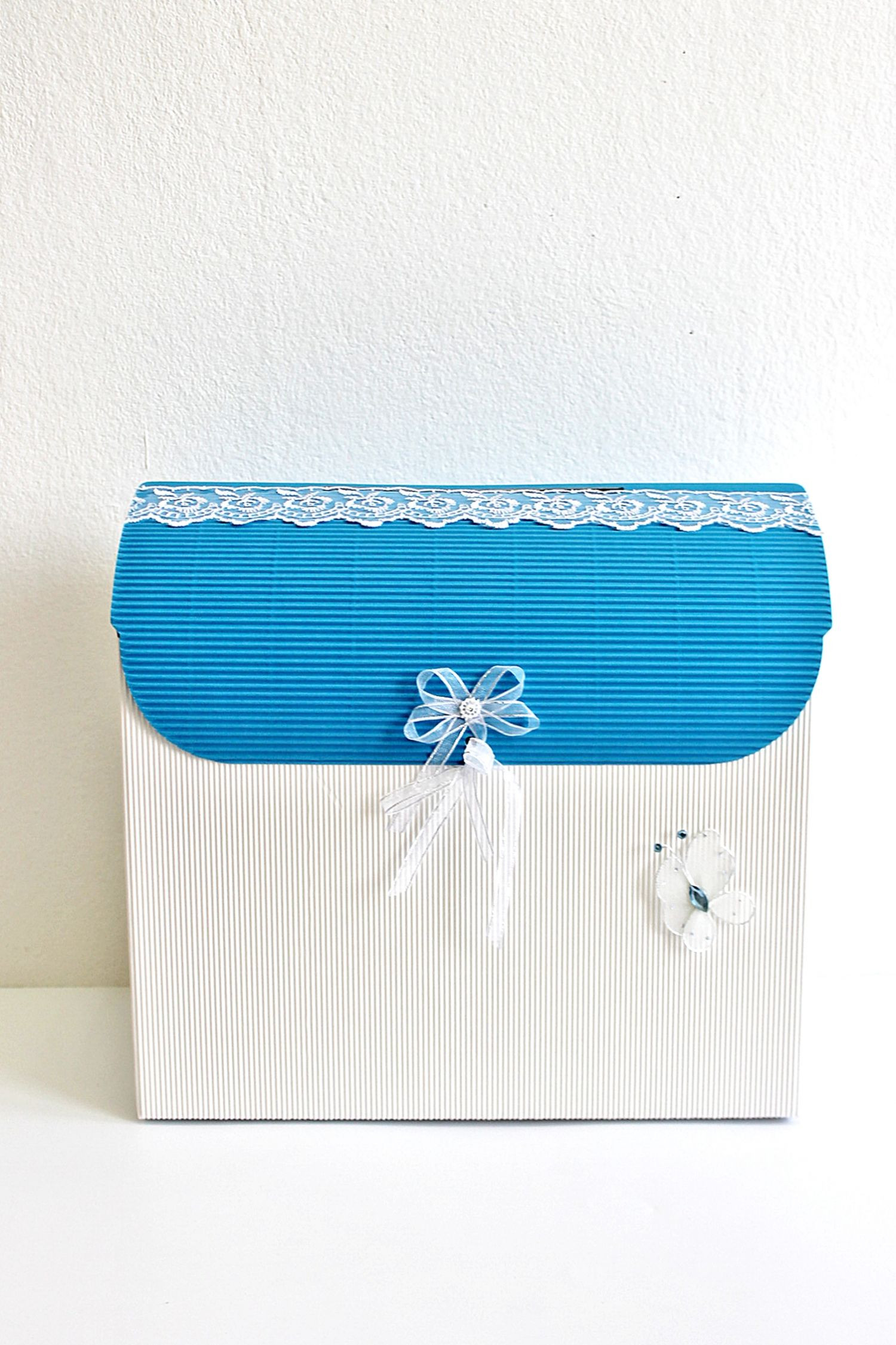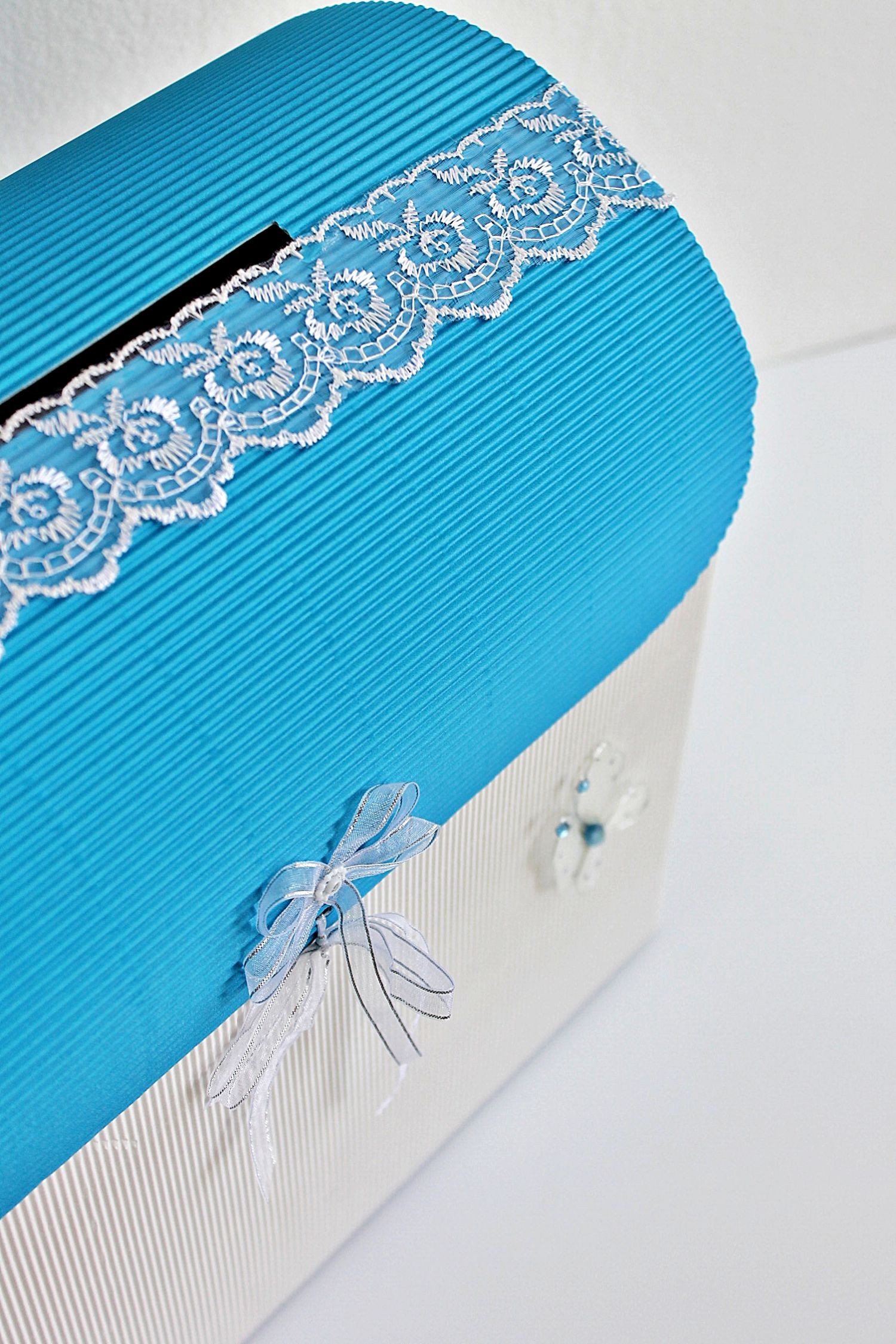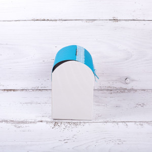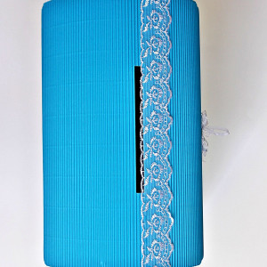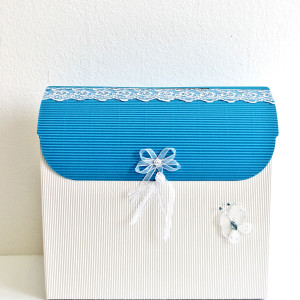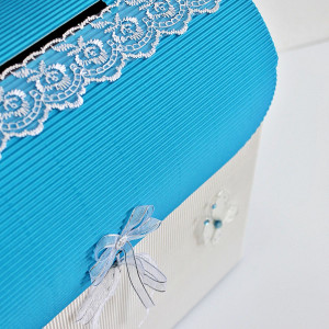 Cutia are capac albastru si este decorata cu fluturas alb, fundita din organza cu fir argintiu si cu o banda din dantela alba lipita pe capac. Fluturasul este realizat din material textil si decorat cu pietricele albastre. Acesta are margine metalica.