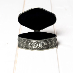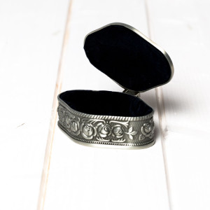 Cutiuta este realizata dintr-un material numit antimoniu si are interior din catifea neagra.