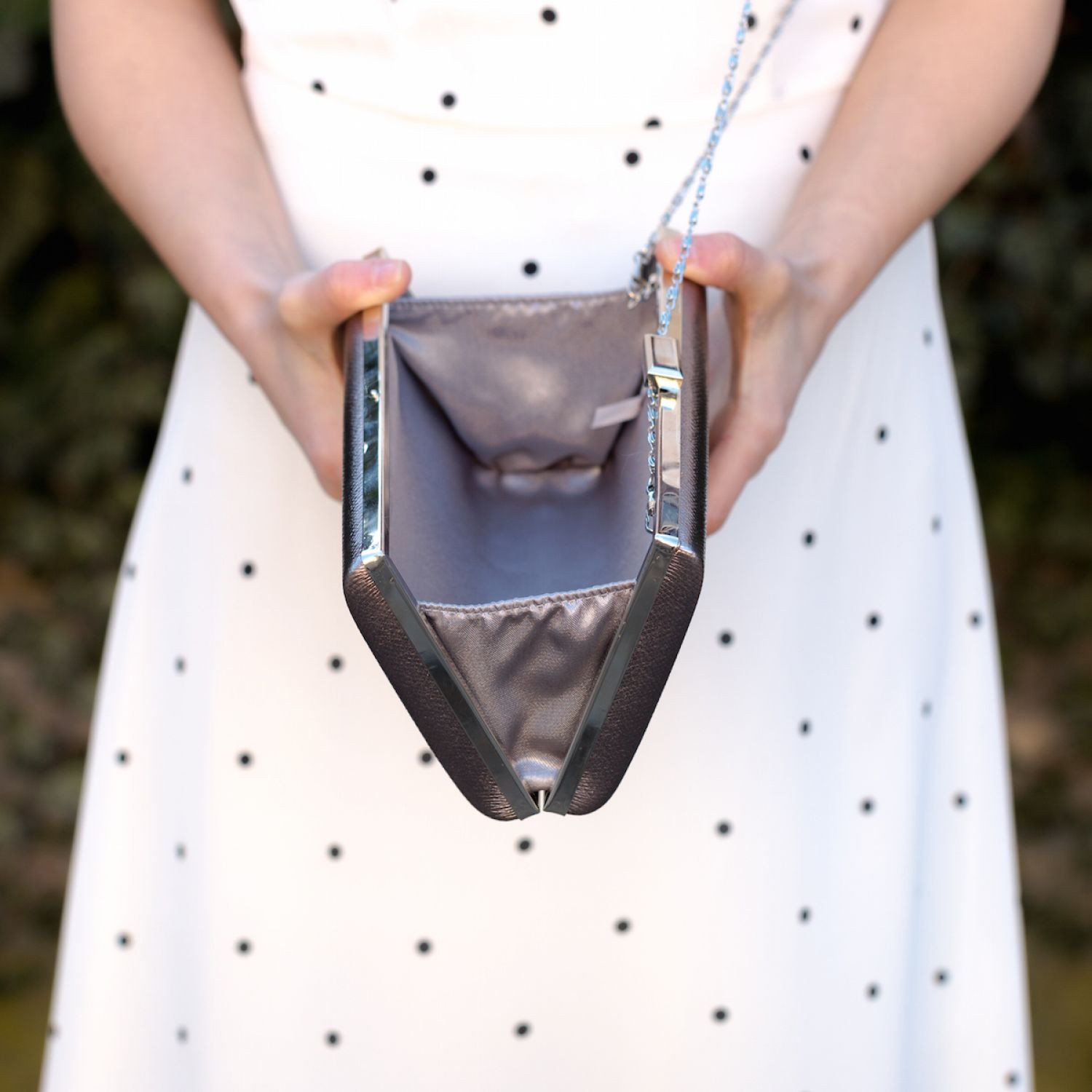 Clutch-ul se inchide cu clema si are lantisor metalic detasabil.