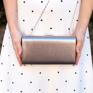 Clutch-ul champagne de forma dreptunghiulara este un accesoriu elegant si modern, realizat din poliester.