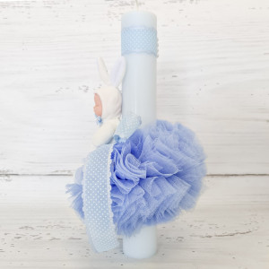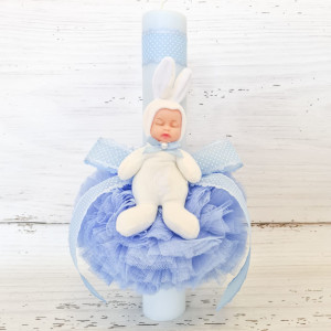 Lumanarea are in partea superioara o panglica din satin in aceeasi culoare cu tulle-ul iar bebelusul poarta un costumas cu urechi de iepuras.