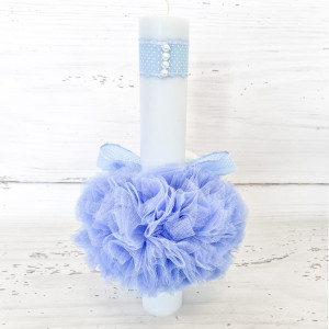 Lumanarea bleu pentru botez cu decor din tulle si bebelus imbracat in costumas alb este o alegere eleganta pentru ceremonia de botez a micului crestin.