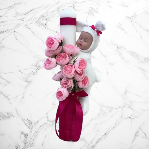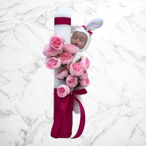 Lumanarea este accesorizata cu o jucarie bebelus imbracat in costum de iepuras.
