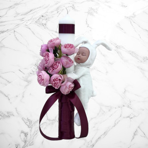 Lumanarea este accesorizata cu o jucarie bebelus imbracat in costum de iepuras.