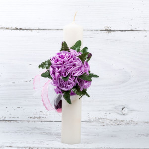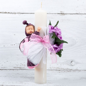 Aceasta lumanare botez are un decor special cu trandafiri lila, tulle alb, buburuza si panglica dantela roz. Lumanarea este o creatie marca SelfEvents.ro.