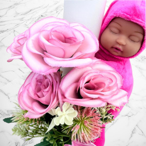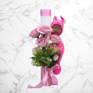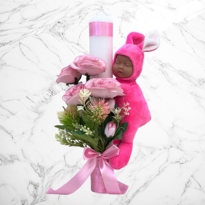Lumanarea este accesorizata cu o jucarie bebelus imbracat in costum de iepuras.