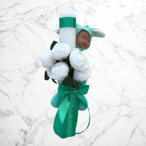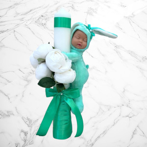 Lumanarea este accesorizata cu o jucarie bebelus imbracat in iepuras.
