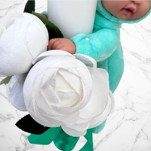 Lumanarea pentru botez este decorata cu banda verde menta si bujori mari albi.