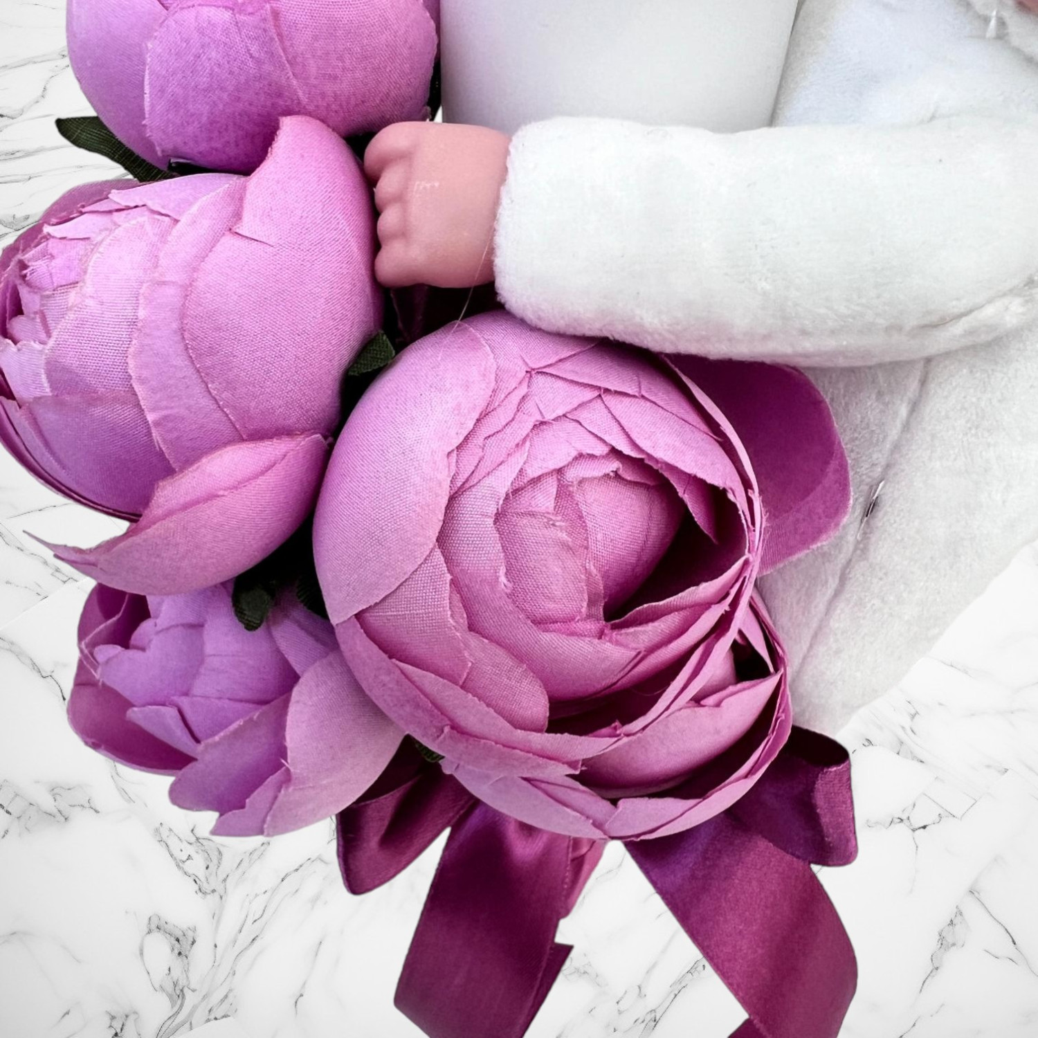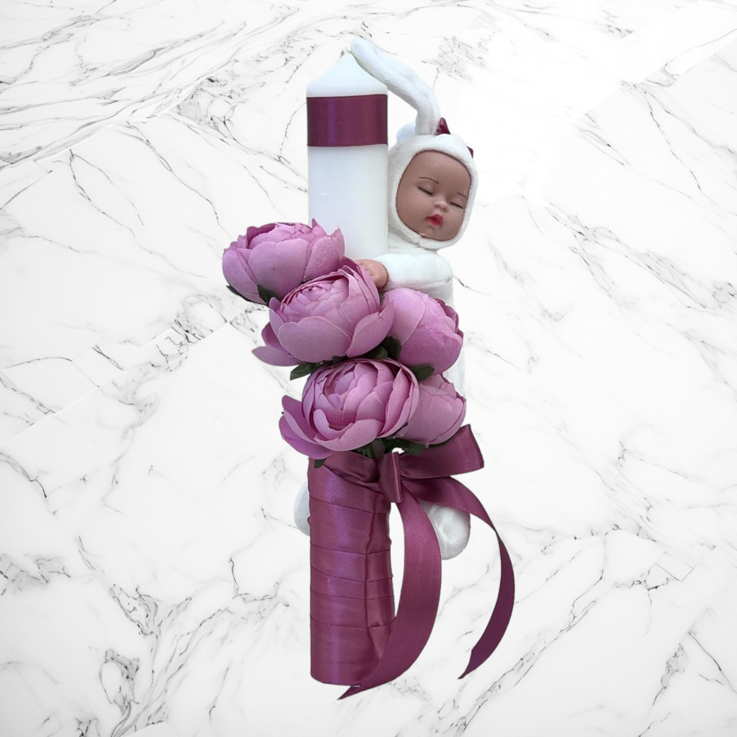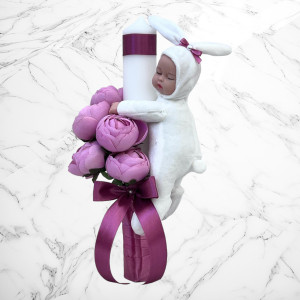 Lumanarea este accesorizata cu o jucarie bebelus imbracat in iepuras.