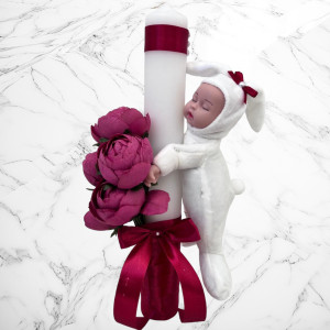 Lumanarea este accesorizata cu o jucarie bebelus imbracat in iepuras.