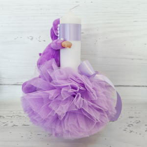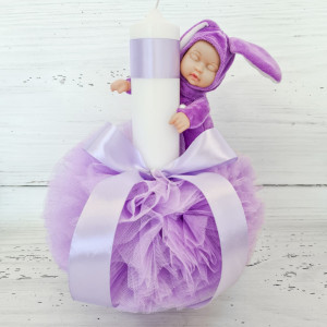 Lumanarea pentru botez cu decor din tulle si bebelus imbracat in costumas lila este o alegere eleganta pentru ceremonia de botez a micului crestin.