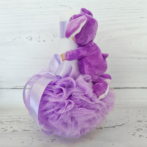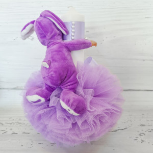 Lumanarea are in partea superioara o panglica din satin in aceeasi culoare cu tulle-ul iar bebelusul poarta un costumas cu urechi de iepuras.
