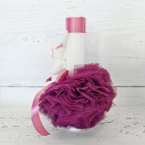 Lumanarea are in partea superioara o panglica din satin in aceeasi culoare cu tulle-ul iar bebelusul poarta un costumas cu urechi de iepuras.