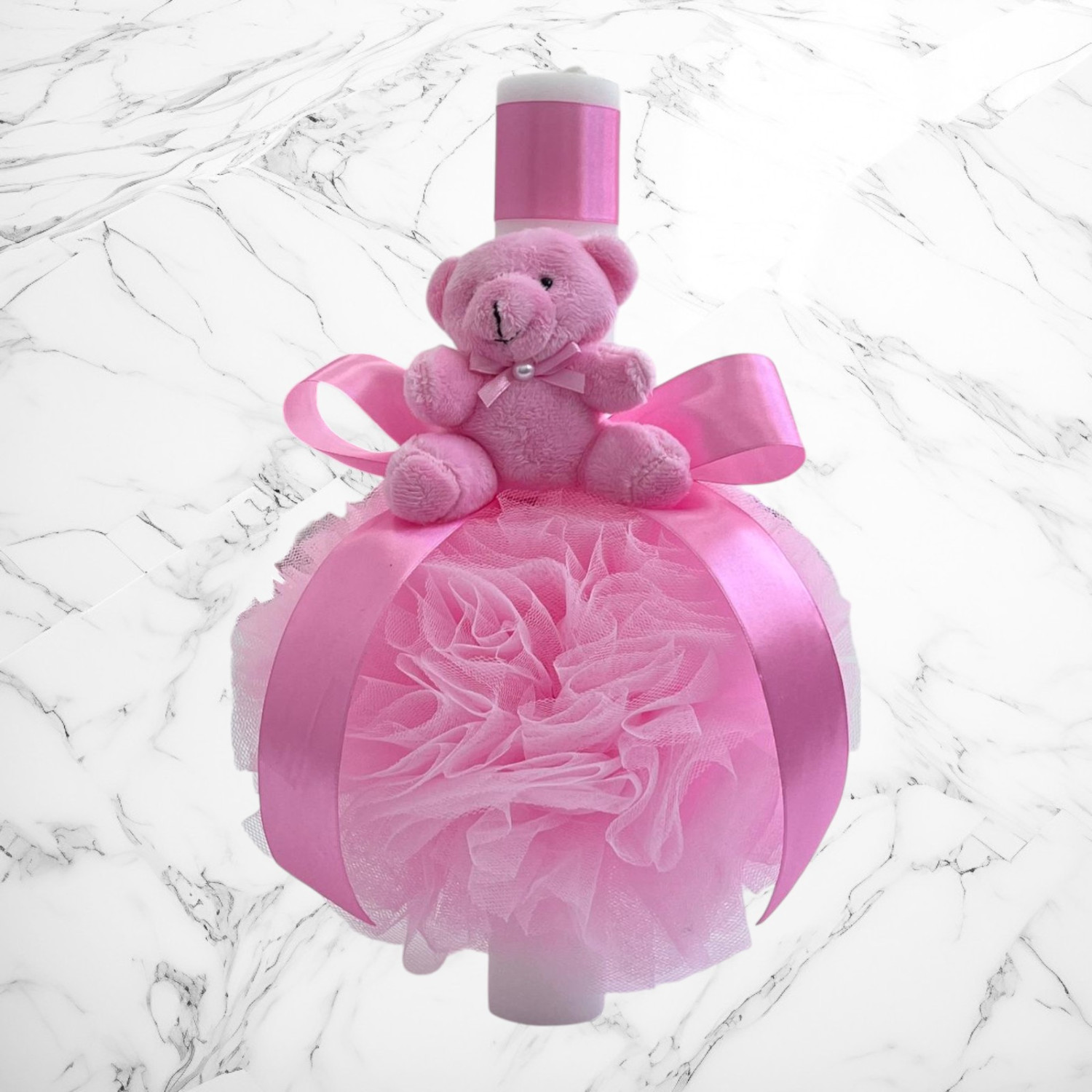 Comanda acum produsul "Lumanare botez decor tulle si ursulet plus roz".