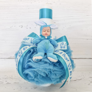 Lumanarea are in partea superioara o panglica din satin in aceeasi culoare cu tulle-ul si una cu mesajul It's a boy iar bebelusul care poarta un costumas cu urechi de iepuras.