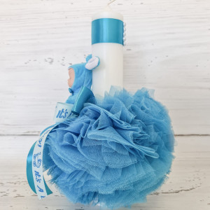 Lumanarea pentru botez cu decor din tulle si bebelus imbracat in costumas tucoaz este o alegere eleganta pentru ceremonia de botez a micului crestin.