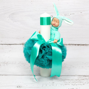 Lumanarea are in partea superioara o panglica din satin in aceeasi culoare cu tulle-ul, iar bebelusul care poarta un costumas cu urechi de iepuras poate fi desprins cu usurinta de lumanare si folosit ulterior ca jucarie.