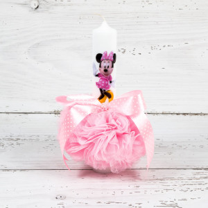 Lumanarea botez cu decor roz si buline este accesoriul ideal pentru momentul crestinarii unei fetite. Lumanarea cu imaginea lui Minnie Mouse si decor roz realizat din tulle si panglica roz cu buline poate fi folosita in orice sezon.