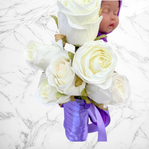 Este decorata cu trandafiri ivory si esteaccesorizata cu o jucarie bebelus imbracat in iepuras.