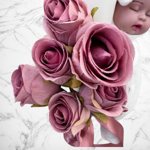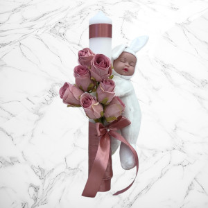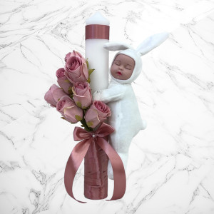 Este decorata cu trandafiri roz pudra si esteaccesorizata cu o jucarie bebelus imbracat in iepuras.