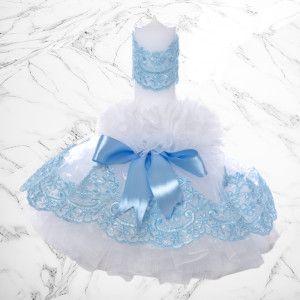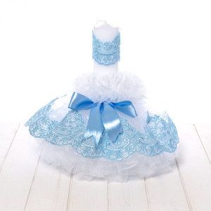 Lumanarea botez cu tulle alb si dantela bleu este un cadou binevenit din partea nasilor pentru finutul lor.