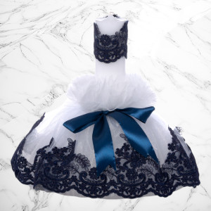 Lumanarea cu decor bicromatic este finisata manual cu tulle alb (simbol al puritatii) si dantela bleumarin (culoarea este specifica baietilor).