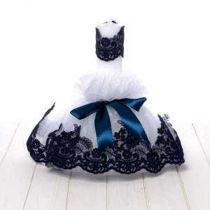 Lumanarea botez cu tulle alb si dantela bleumarin este un cadou binevenit din partea parintilor spirituali pentru finutul lor.