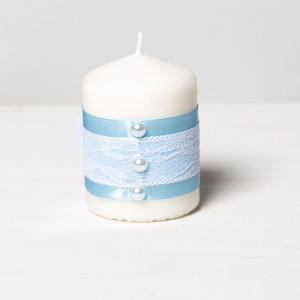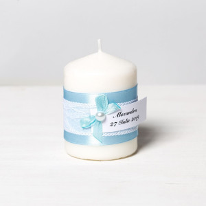 Marturii botez lumanari banda bleu satin, dantela alba si fundita bleu