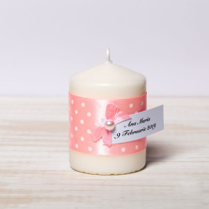 Lumanarile decorate manual cu banda roz si buline, respectiv fundita roz cu perluta arata ca aceste marturii se ofera in dar doar la petrecerea unei fetite.