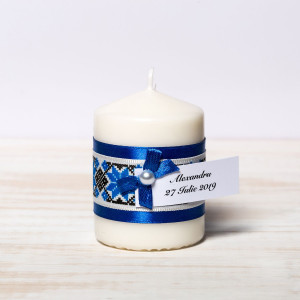 Aceste marturii amintire sunt decorate manual cu o banda satinata de culoare albastra si cu o banda lipita deasupra cu model traditional.
