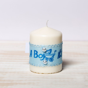Alege pentru prima petrecere importanta din viata baietelului tau marturii botez cu decor bleu si mesajul It s a boy (este baiat). Pe spatele lumanarii sunt lipite doua perlute bleu.