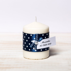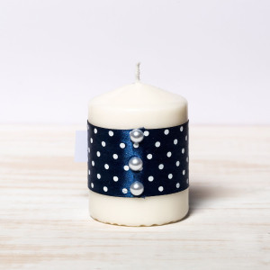 Lumanarile decorate festiv cu banda din satin bleumarin cu buline albe, fundita asortata si perluta alba in mijloc reprezinta o amintire de durata pentru invitati.