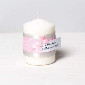 Pentru prima petrecere importanta din viata fetitei tale, poti alege marturii cum sunt lumanarile decorate manual festiv intr-o combinatie coloristica de argintiu, alb si roz.