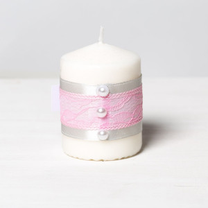 Lumanarile sunt decorate cu banda din satin argintiu, dantela roz si fundita alba cu jumatate de perla alba in centru.